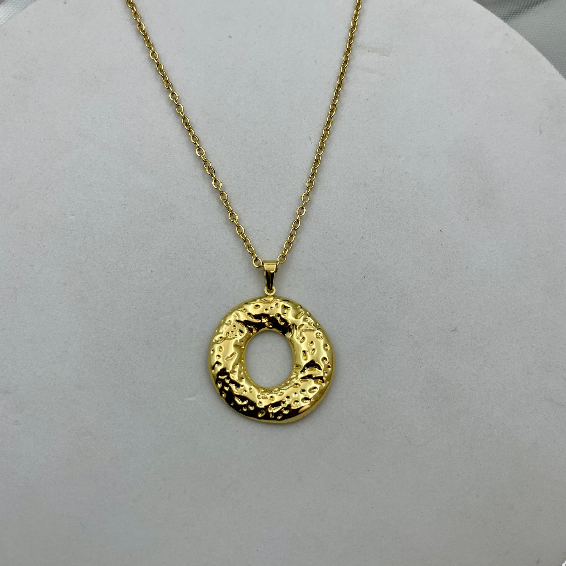 Make a bold statement with our Hammered Gold Circle Pendant, where artisan craftsmanship meets contemporary design. This striking piece features a textured open-circle pendant with hand-hammered detailing, creating a unique play of light and dimension that catches the eye from every angle.